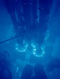 I vandbassinerne på atomkraftværker kan man se et blåt cherenkovlys, som kommer fra ladede partikler, der bevæger sig hurtigere igennem vandet end lyset. Anledningen til lyseksplosionen er, at den ladede partikel polariserer de omgivende molekyler. Disse vil hurtigt overgå fra en exciteret tilstand til en tilstand med lavere energiindhold og afgiver dermed en kohærent bølgefront af lys. Dannelsen af cherenkovstråling kan sammenlignes med dannelsen af den lydkegle som opstår bagved fly eller geværkugler ved overlydshastighed.