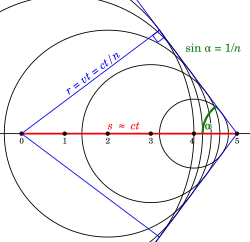 og der dannes dermed cherenkovstråling. Stråling udsendt til tiden 0 vil til tiden have rejst afstanden :