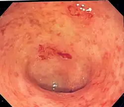 ![]() Endoskopisk billede af et sigmoidalt colonsegment ramt af ulcerøs colitis. | |