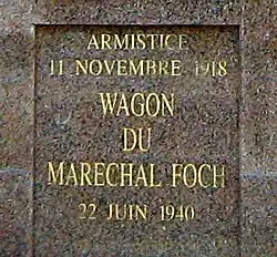 Første gang var ved afslutningen af 1. verdenskrig i 1918, hvor Tyske Kejserrige blev tvunget til at underskrive en ydmygende fredsaftale. Anden gang var ved afslutningen af 2. verdenskrig i 1940, hvor Adolf Hitler ydmygede Frankrig ved at tvinge franskmændene til at underskrive en overgivelse i den selvsamme jernbanevogn, placeret samme sted som i 1918.