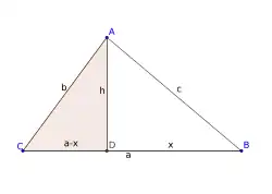 Vinkel B (i den hvide retvinklede trekant) kan udregnes af: cos(B) = x / c Ved at isolere x i denne ligning får man: x = cos(B) · c.