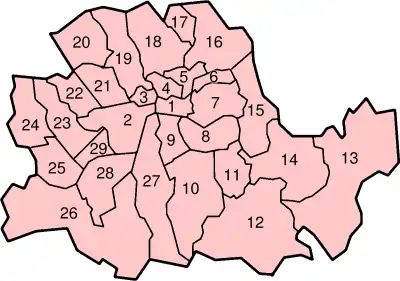 I 1889, elleve år efter at grevskabet blev oprettet, blev det inddelt i 28 bydele, metropolitan boroughs. Disse erstattede de gamle verdslige sogne, i London kaldt vestries og distrikterne. I 1965 blev disse slået sammen til tolv af de nuværende bydele i London.