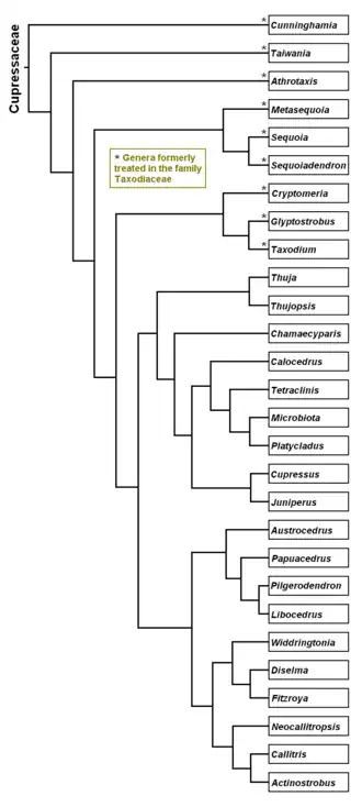 En række af disse slægter (Athrotaxis, Cunninghamia, Glyptostrobus, Cryptomeria, Sequoiadendron, Sequoia, Taxodium, Metasequoia) regnedes tidligere som en egen familie, Sumpcypres-familien (Taxodiaceae), der tillige omfattede Parasoltræ-slægten (Sciadopitys). Parasoltræ-slægten henregnes i dag til sin egen familie, Parasoltræ-familien (Sciadopityaceae), mens resten nu henregnes til Cypres-familien hvor de undertiden stadig omtales samlet som "sumpcypres-gruppen".[1]