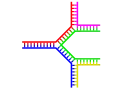 DNA "flosser", når ikke-komplementære regioner eksisterer i enden af en ellers komplementær dobbelt-strenget DNA. Forgrenet DNA kan dog opstå, hvis en tredje streng af DNA introduceres og indeholder tilstødende regioner i stand til at hybridisere med de flossede regioner i den allerede eksisterende dobbelt-streng. Selvom det mest simple eksempel på forgrenet DNA kun involverer tre DNA-strenge, er det også muligt at skabe komplekser med yderligere strenge og flere grene.[68] Forgrenet DNA kan bruges i nanoteknologi til at konstruere geometriske former.