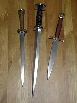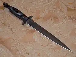 - ↑ Burton, Walter E., Knives For Fighting Men, Popular Science, July 1944, Vol. 145 No. 1, p. 150: The dagger is classified as a type of fighting knife, while a combat knife is a knife specifically designed for military use, and is thus only certain types of daggers designed for military use are considered to be combat knives. Thus, an ordinary dagger designed for civilian sale and use is only a fighting knife, while the U.S. Army M3 trench knife is both a combat knife and a fighting knife.