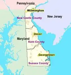 Delaware er inddelt i tre amter: Fra nord til syd, New Castle County, Kent County og Sussex County.