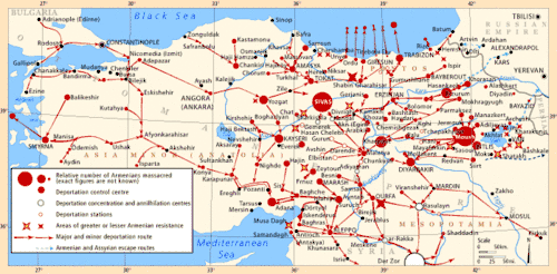 - ↑ Kilder som viser til dette, Le Siècle des camps af Joël Kotek og Pierre Rigoulot, JC Lattes, 2000. Ahmed Djémal pacha et le sort des déportés arméniens de Syrie-Palestine af Raymond H. Kévorkian. Der Völkermord an den Armeniern und die Shoah, Zürich: Chronos, 2002. af Hans-Lukas KIESER oh Dominik J. SCHALLER (dir.), og fra samme forfatter: L’extermination des déportés arméniens ottomans dans les camps de concentration de Syrie-Mésopotamie (1915-1916), la deuxième phase du génocide, i Revue d’Histoire arménienne contemporaine II (1998). Konsentrationslejrkort fra J.M. Winter, professor fra Yale, America and the Armenian Genocide of 1915, Cambridge Universitet (Januar, 2004)