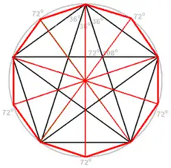 Gyldne trekanter ses også i en regulær tikant som den der ses i figuren til højre, hvor den er tegnet ind oven på et pentagram. Her er buelængden mellem hvert hjørne i tikanten nu 36°, og derfor er de ti trekanter med toppunkt i figurens centrum ensvinklede med ΔQPR i pentagrammet ovenfor og altså gyldne trekanter. Hvis vi kalder radius i tikantens omskrevne cirkel for r og tikantens sidelængde for s, kan man altså udtrykke følgende sammenhæng mellem r og s: