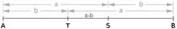 Det gyldne snit kan også foretages symmetrisk, som man ser på figuren til højre, hvor både S og T deler AB i det gyldne snit. Afstanden |ST| vil herved blive a-b. Det viser sig, at T også er det punkt, der deler liniestykket AS i det gyldne snit. Hvis vi antager, at det gælder, ser betingelsen nemlig sådan ud: