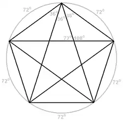 Et af stederne, hvor det gyldne snit optræder, er i en regulær femtakket stjerne, et pentagram. En sådan ses på på figuren til venstre omskrevet af en regulær femkant, en pentagon. Til højre er desuden indtegnet den omskrevne cirkel, og alle relevante vinkler er indtegnet. De fem vinkelbuer vil alle være på 360°/5 = 72°. Derfor er den spidse vinkel på en tak og dens to nabovinkler alle 72°/2 = 36°. Den spidsvinklede trekant i takken er ligebenet, så de to andre vinkler i trekanten vil være (180°-36°)/2 = 72°. De stumpe vinkler ved siden af disse vinkler vil være 180°-72° = 108°.
