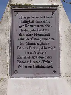 På den tyske ø Femern, i Burgstaaken syd for byen Burg, findes et mindesmærke, der nævner en baron «Dirking-Holmfeld», som blev taget til fange under Treårskrigen. Indskriften siger: På dette sted mindes de urokkelige handlekraftige Femeranere, der befriede øen fra dansk herredømme og tilfangetagelsen af marinekaptainen baron af Dirking-Holmfeld den 15. April 1848. Oprettet 1872 af baron af Leesen-Treben, tidligere af Cathrinenhof.