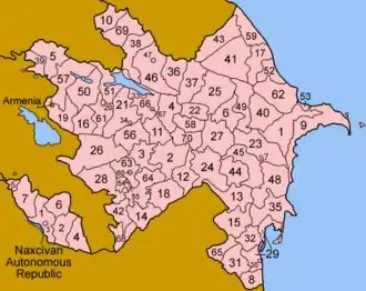 Aserbajdsjan er opdelt i 59 distrikter (rayonlar) og 11 byer (şəhərlər). Den autonome republik Nakhitjevan (Naxçıvan Muxtar Respublikası) består af 7 distrikter og en by.