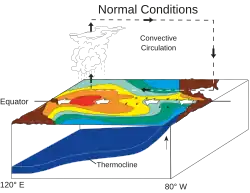 Den normale fase: det varme vand blæses mod vest af passatvinden og koldt, næringsrigt vand strømmer op