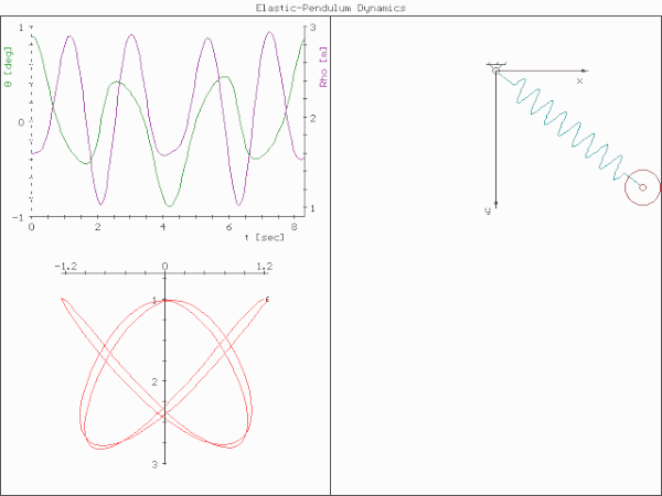 Simulation af det elastiske pendul. Øverst til venstre er de polære koordinater.