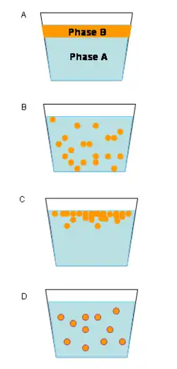 En emulsion kan dannes ved at hælde vand og olie sammen og ryste det kraftigt. Hvis man ikke ryster det lægger olien sig blot oven på vandet. Emulsioner er ikke stabile, og de vil med tiden skille ad så der igen dannes en ren vandfase og en ren oliefase. Dette skyldes, at når to væsker ikke er blandbare, vil de ordne sig således at kontakten imellem dem er mindst mulig. Det er et udtryk for den kraft, som kaldes overfladespænding.