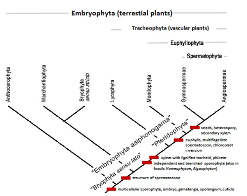 Landplanter (Embryophyta) blev opdelt i to divisioner, Embryophyta Asiphonogama (sporeplanter som mosser (Bryophyta), og bregner og ulvefødder (Pteridophyta)) og Embryophyta Siphonogama (frøplanter opdelt i nøgenfrøede (Gymnospermae) og dækfrøede (Angiospermae)), men blev senere underopdelt. Embryophyta Siphonogama erstattede det ældre udtryk Phanerogamae, og klasserne blev yderligere opdelt i grupper af familier, kaldet ordener. De nøgenfrøede blev således inddelt i syv ordener og de dækfrøede i 55 ordener.