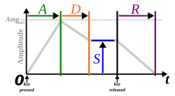 ADSR står for Attack Decay Sustain Release, som drejer sig om A: hvor hurtigt tonen når fuld styrke i anslaget – D: hvor hurtigt lydstyrken derpå falder til sustain-niveau – S: styrken i den tid tonen varer og R: hvor lang tid tonen er om at klinge ud. (Fra den svenske ADSR).