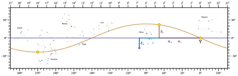 Som figuren viser, måles rektascensionen fra forårspunktet, som er det punkt på himlens ekvator, hvor Solen krydser fra den sydlige til den nordlige himmelhalvkugle; det sker på en af dagene omkring den 21. marts. Deklinationen måles vinkelret på ekvator. Forårspunktets koordinater er derfor , ; efterårspunktets koordinater er . For himlens nordpol er og for himlens sydpol er . Koordinaterne til den polnære stjerne Polaris er .