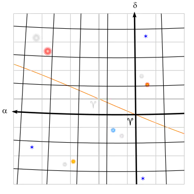 Tabellen herunder indeholder fire udsnit, A, B, C og D, af himlen omkring forårspunktet, der er skæringspunktet mellem himlens ekvator og ekliptika (orange farve). Forårspunktet markeres traditionelt med et stiliseret vædderhorn. Maskestørrelsen for gradnettet er . De indtegnede himmellegemer er fiktive og skal illustrere koordinatændringer på grund af ændring af epoke og/eller ekvinoktium. De tre blå sekstakkede objekter er kvasarer, der på grund af deres ekstremt store afstande kan anses for ikke at ændre position; de står samme sted på alle fire illustrationer. Desuden er der indtegnet fire stjerner, alle med en fiktivt stor egenbevægelse.