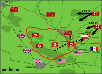 3. amerikanske armé: 2. franske pansrede division, 90. infanteridivision.[3] - ↑ Historikerne Carlo D'Este og Milton Shulman angiver, at 80.000 tyske soldater blev fanget i Falaise-lommen.[4][7] Terry Copp og Chester Wilmot hævder at mindst 100.000 tyskere blev fanget[8][9] mens Max Hastings abgiver at tallet var mindst 150.000 mand.[10]