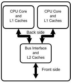 Diagram over en generisk dual-core processor, med CPU-lokal level 1 caches, og en delt, on-chip level 2 cache.