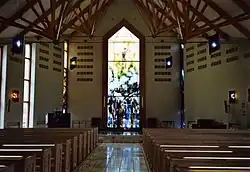 Kirken er tegnet af "Landbbeifelagið". Tróndur Patursson har stået for den kunstneriske udsmykning og bl.a. lavet altertavlen i glasmosaik, som giver kirken en speciel belysning. Midterpartiet bag alterbordet viser den verden, vi lever i. Farverne i mosaikken er i første omgang de samme, som ses i kaosfeltet i venstre side. Man ser et fjeld gennemskåret af en kløft. På venstre side ser vi en række mennesker, der spejder ud over havet, hvor der er en båd. De spejder efter båden og håber på, at den kommer sikkert i havn. Der er en dobbelttydning i det, de ser. De ser ikke blot båden, men også Jesus – håbet og redningen.