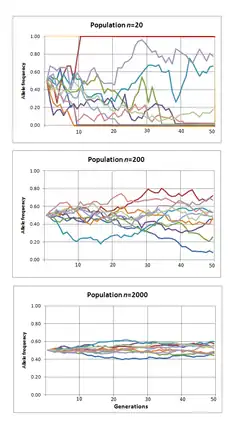Diagrammet th. viser: Ti simulerede forløb af tilfældig genetisk drift, for en given variant, med start udbredelse i halvdelen af population en. Beregnet over 50 generationer for tre forskellige populationsstørrelser. I disse simulationer driver varianten kun helt bort eller til fiksering (udbredelse 0 eller 1) i den mindste gruppe (population).