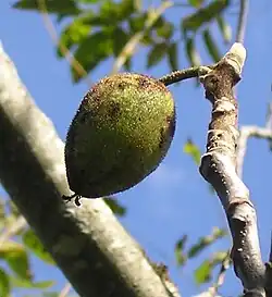 Frugterne er 6-8 centimeter aflange og tilspidsede stenfrugter, hvor stenene er nødder. Frugterne er klæbrige med en kraftig lugt.[2] De er modne i september.[4]