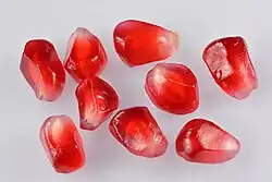 Den læderagtige frugtskal gemmer på kerner indkapslet i rødt, saftigt frugtkød, som holdes på plads af et guligt gitterværk. Frugten har sæson i det sene efterår og hen over vinteren. Man bruger kernerne eller saften fra de pressede kerner i madlavning, hvor de tilføjer en frisk, sød og let syrlig smag.