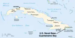 Kort over Cuba, med en indikation af Guantanamo Bay.