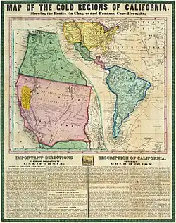 Mellem 1847 og 1870 voksede befolkningen i San Francisco fra 500 til 150.000.[105] Velstanden fra guldfeberen og befolkningsvæksten førte til væsentligt forbedrede transportveje mellem Californien og østkysten. Jernbanen over Panamatangen blev indviet i 1855.[106] Dampskibe, herunder de som var ejet af Pacific Mail Steamship Company, begyndte at sejle i rute fra San Francisco til Panama, hvor passagerer, varer og post blev sendt med tog over tangen og videre med dampskibe til østkysten. En ulyksalig rejse med S.S. Central America,[107] endte med en katastrofe da skibet sank i en orkan ved Carolinakysten i 1857, med omkring 3 tons guld fra Californien om bord.[108][109]