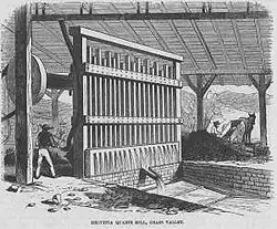 Såvel under guldfeberen som i de efterfølgende årtier arbejdede guldgravere også med at udvinde guld direkte fra den guldholdige klippe – som i reglen var af kvarts. Det skete ved at grave og sprænge klippen for at følge årer af guldholdig kvarts.[78] I 1851 var udvinding af guld fra kvarts blevet den største erhvervsgren i Coloma.[79] Når den guldholdige klippe kom op fra undergrunden blev stenene knust og guldet udvundet ved hjælp af vand eller separeret, hvilket som regel foregik med arsenik eller kviksølv (yderligere en kilde til forurening).[80] Til sidst blev udvinding af guld fra guldholdige klipper den største kilde til guld i guldfelterne.[71][81]