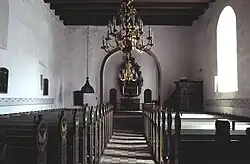 Apsis har halvkuppelhvælv og bevaret apsisbue, kor og skib har bjælkeloft. Korbuen er noget udvidet. Altertavlen er en renæssanceramme fra omkring 1640 med maleri af Anton Dorph fra 1892. På alterbordets forside er ophængt et nyere tekstil. Prædikestolen fra 1585 bærer våben for Bjørn Kaas og Christence Nielsdatter Rotfeld. Fontehimlen er fra 1676 og bærer våben for Hans Juul og Lisbeth Krag. I koret er opsat stolegavle fra 1698 med fædrene og mødrene våben for Henrik Friis og Sophie Juul. I sydkapellet står en figursten med anevåben over Bjørn Kaas (død 1581) og Christence Nielsdatter Rotfeld. Kirkens inventar blev istandsat i 1963-64.