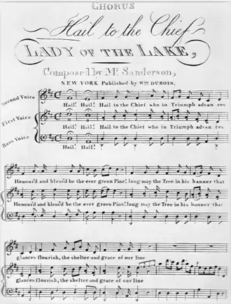 En version af Lady of the Lake debuterede i New York 8. maj 1812, og "Hail to the Chief" blev udgivet i Philadelphia omkring samme tidspunkt, som 'March and Chorus in the Dramatic Romance of the Lady of the Lake'. De mange parodier der opstod var et sikkert tegn på den universelle popularitet.