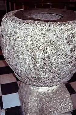 Den romanske døbefont af granit har løver på kummen og vegetativ udsmykning på den firkantede fod.