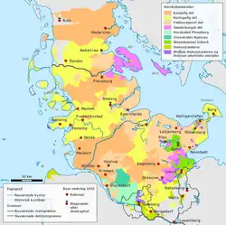 I løbet af 1300-tallet indvandrede en holstensk adel, som bevarede deres tyske sprog. De etablerede sig som Sønderjyllands overklasse og fik kontrollen over landets videre udvikling.[13] Også i byerne vandt tysk sprog frem, hvorimod folkesproget i landdistrikterne forblev dansk.[14]