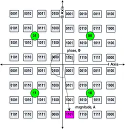 Figuren viser en lagdelt skema med QPSK basis-lag og et 16QAM enhancement-lag. Det første lag er 2 bit (repræsenteret ved de grønne cirkler). Signaldetektoren behøver kun at måle hvilken kvadrant signalsymbolet er i, for at genskabe værdien (som er '10', den grønne cirkel i den nedre højre hjørne). Under bedre signalbetingelser, kan detektoren måle fasen og amplituden mere præcist, for at genskabe fire mere bit af data ('1101'). Opsummeret, basis-laget formidler '10' - og enhancement-laget formidler '1101'.[3]