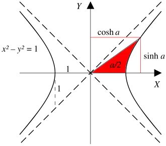 I samme koordinatsystem er enhedshyperblen beskrevet ved ligningen . De to vigtigste hyperbolske funktioner kan nu defineres ved parametriseringen og , hvor den variable kaldes den hyperbolske vinkel. Den kan identificeres med arealet som er begrænset af hyperblen vist i figuren. Indsat vil disse to funktioner derfor opfylde den fundamentale ligning . I modsætning til de trigonometriske funktioner, kan disse to hyperbolske funktioner derfor antage vilkårligt store værdier.