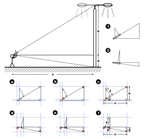 Som vist som første trin i illustrationen går den ene sigtelinje til toppen af objektet, som man vil beregne hoyøjden på, mens linjen h' går horisontalt mod objektet. Fra iagttagerens synsrand skal punktet h stå vinkelret på genstanden. Dermed kan man kalkulere højden fra h til toppen. Tilsvarende i næste trin på illustrationen, hvor man sigter grunnen, hvor objektet er placeret mod punktet d'. Beregningen af denne trekant vil angive værdien af målet fra øjelinjen og ned. Endelig skal afstanden x fra iagttageren til objektet å måles. X er afstanden mellem måleinstrumentet og genstanden, som skal måles.