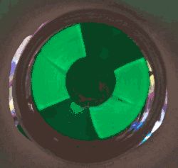 Elektroner udsendes fra den negative katode og accelererer hen imod den positive anode. De afbøjes i større eller mindre grad af spændingen på et gitter, en spænding der gennem forstærkning er proportional med det signal, hvis styrke skal vises. Elektronerne rammer derpå en skærm, der er belagt med en fosforescerende belægning, og som lyser grønt op. Mønstret af de grønne lys viser udslaget.