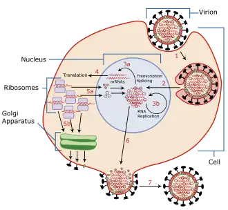 - ↑ Cros, J; Palese, P (september 2003). "Trafficking of viral genomic RNA into and out of the nucleus: influenza, Thogoto and Borna disease viruses". Virus Res. 95 (1-2): 3-12. doi:10.1016/S0168-1702(03)00159-X. PMID 12921991.