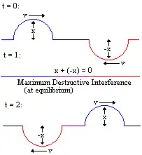 "Forsinker" man nu det ene signal, så det svinger "i modtakt" med det andet, bliver faseforskellen 180°, eller π rad: Så "mødes" bølgetoppe fra det ene signal med bølgedale fra det andet signal—signalerne bliver trukket fra hinanden, og slutresultatet bliver et signal hvis amplitude er den numeriske differens mellem de to bidragende signalers amplituder. Er de to signaler lige store, udslukker de fuldstændig hinanden, og man taler da om destruktiv interferens.