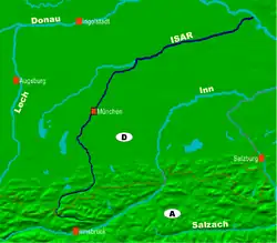 Floden udspringer ved den bayersk-østrigske grænse i nærheden af landsbyen Mittenwald i alperne. Derfra løber den nordover, gennem den bayerske hovedstad München og nordøstover til Deggendorf, hvor den munder ud i Donau.