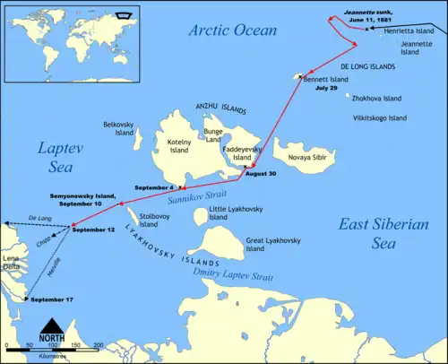 På St Michael hyrede De Long to erfarne Inuit hundeførere og tog en række slædehunde ombord.[66] Den 21. august afsejlede Francis Hyde efter at have overført sin last af forsyninger og brændstof, og "Jeannette" satte kursen mod Chukchi-halvøen på den sibiriske kyst for at spørge efter Nordenskiöld.[67] Ved Saint Lawrence Bay rapporterede Chukchi-folkene, at en uidentificeret damper for nylig var gået forbi mod syd. De Long sejlede der efter gennem Beringstrædet mod Cape Dezhnev, hvor han erfarede fra lokalbefolkningen, at et skib havde kontaktet Cape Serdtse-Kamen længere nede langs kysten.[68] Her fastslog en langående gruppe fra Jeannette hurtigt fra genstande, der blev efterladt hos landsbyboere, at dette skib var "Vega", og at Nordenskiölds ekspedition derfor havde afsluttet sin rejse sikkert mod nordøst. De Long noterede sig sine resultater for overførsel til Washington.[69] Den 31. august afsejlede "Jeannette" i formodet retning mod Wrangel's Land, hvor han ønskede at etablere sit vinterkvarter.[70][67]