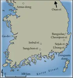 De vigtigste kendte fundsteder er Amsa-dong i Seoul, Sopohang (Rason), Gado (Jeonbuk), Osan-ri (Gangwon), Sejuk-ri (Ulsan) og Dongsam-dong i Busan.
