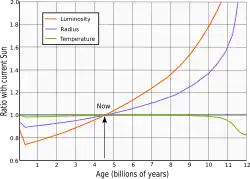 Resultatet af denne proces har været en stabil stigning i solens energiproduktion. Da Solen først blev en stjerne i den såkaldte 'hovedserie' i Hertzsprung-Russell-diagrammet, udstrålede den kun 70% af den aktuelle lysstyrke. Lysstyrken er forøget næsten lineært op til nutiden med ca. 1% for hver 110 millioner år.[71] Ligeledes forventes solen om tre milliarder år at være 33% mere lysstærk. Brintbrændstoffet i kernen vil endelig være opbrugt om ca. fem milliarder år, hvor solen vil være 67% mere lysende end på nuværende tidspunkt. Derefter vil solen fortsætte med at brænde brint i en skal, der omgiver dens kerne, indtil lysstyrken når 121% over den nuværende lysstyrke. Det markerer afslutningen på Solens tid som en stjerne i hovedserien; derefter vil den passere gennem en fase som 'underkæmpestjerne' (en: 'subgiant') og udvikle sig til en rød kæmpe.[1]