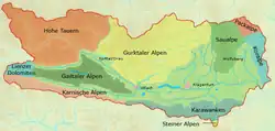 Bjergene er højest i nordvest, hvor Kärnten har del i Hohe Tauern samt Østrigs højeste bjerg Großglockner. Andre væsentlige bjerge er Gailtaler Alperne, De Karniske Alper og Karawanken i syd samt Gurktaler Alperne i nord.