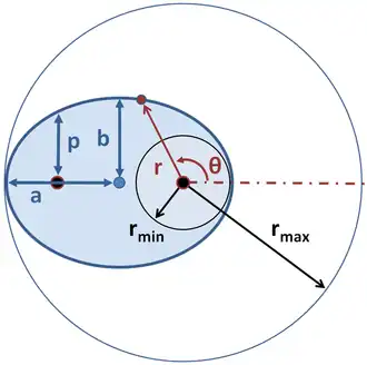 hvor og er konstanter, er excentriciteten, mens er afstanden til Solen, og er vinklen. [1]