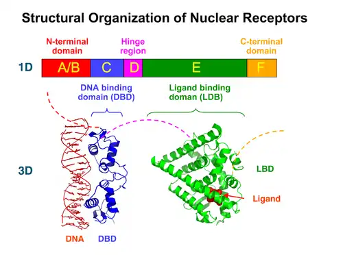 - (D) Hængsels-domæne (Hinge region) er et fleksibelt domæne, der forbinder DBD med LBD og har betydning for transport og subcellulær lokalisering.