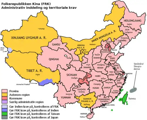 Kina er involveret i en langvarig konflikt om Taiwans politiske status. Kuomintang, der var kommunisternes rival under den kinesiske borgerkrig, trak sig tilbage til Taiwan i 1949 og påstod at være de retmæssige ledere af Kina og Mongoliet. Siden 1990'erne har Taiwan opgivet de krav. Folkerepublikken mener, at Taiwan er en provins i Kina og truer med krig, hvis Taiwan officielt erklærer sig for uafhængig.